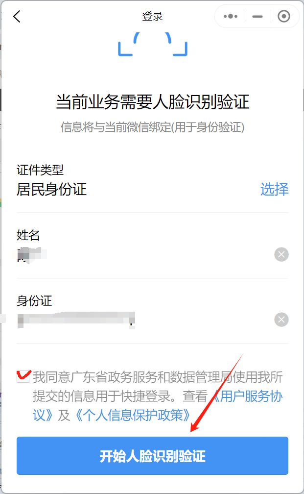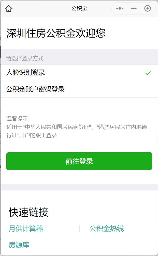 1、通过上方入口进入“粤省事”微信小程序的深圳住房公积金登录页面,选择人脸识别登录或者公积金账户密码登录