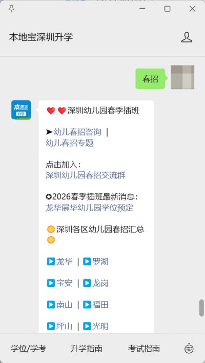 温馨提示:微信搜索并关注【本地宝深圳升学】,在对话框回复【幼儿春招】获取2026深圳幼儿园春季招生时间、春招名单、春招报名入口、幼儿园地址+电话、幼儿园补贴申请等最新消息
