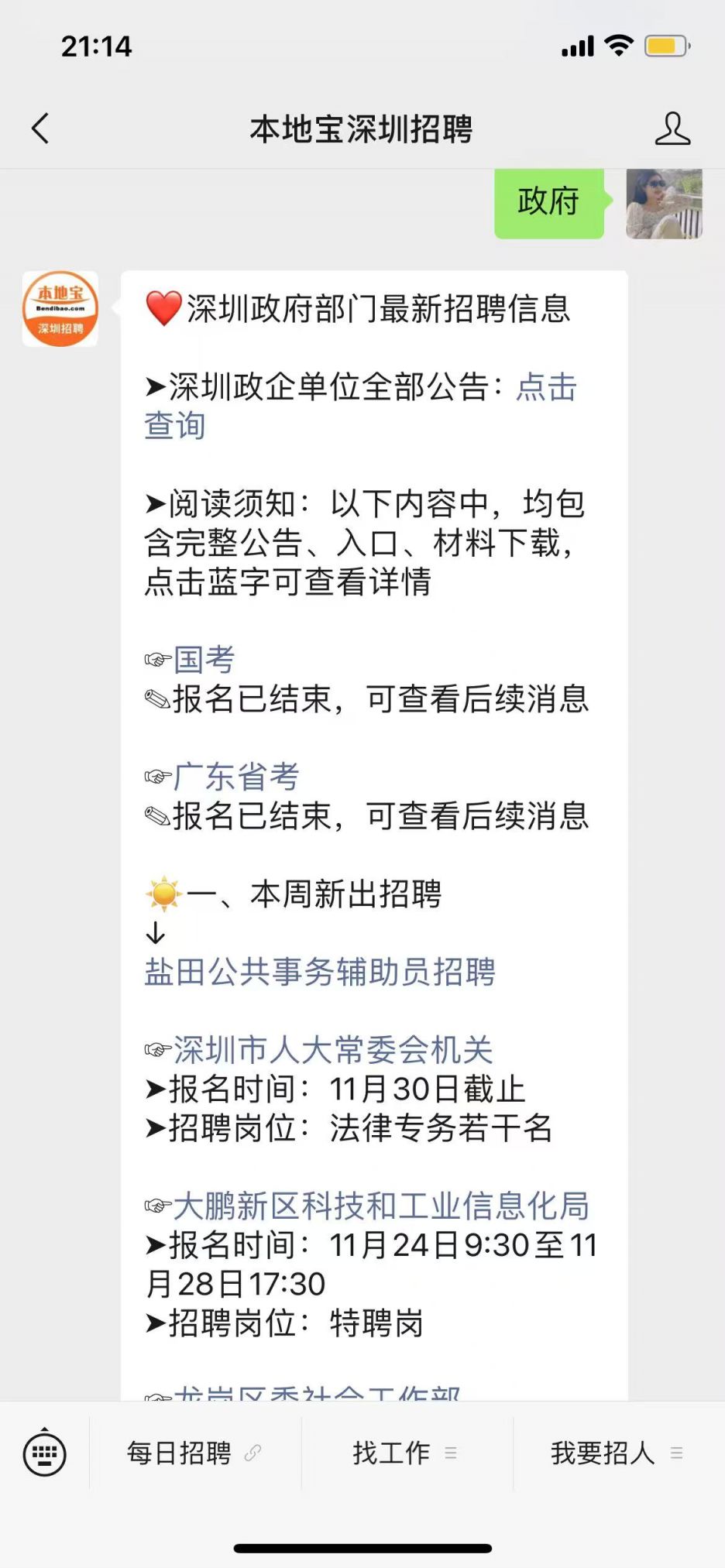 温馨提示:关注【本地宝深圳招聘】公众号,回复【政府】,即可获取深圳十区政府部门招聘公告全文、官方报名入口、查询岗位表、下载报名材料、咨询电话