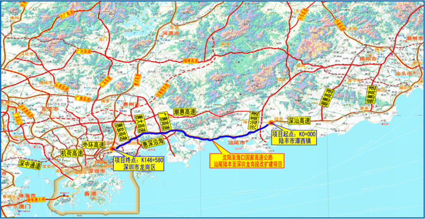 深汕西高速改扩建项目起于陆丰市潭西镇,路线向西途经汕尾市城区、海丰县、深圳市深汕特别合作区、惠州市惠东县、惠州市惠阳区、深圳市坪山区,终于深圳市龙岗区,全长约146.55km,其中深汕段全长约18.48km。
