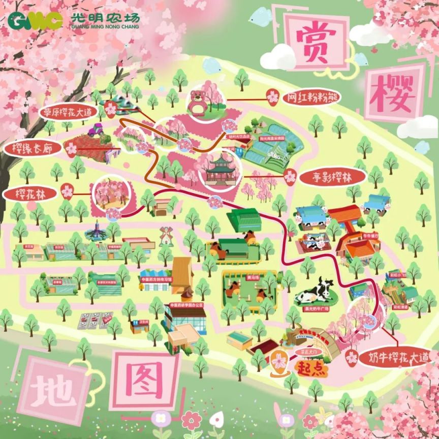 赏樱花地点:院内的奶牛樱花大道、草原樱花大道、樱缘长廊、亭影樱林、樱花林,具体点位详见下图